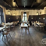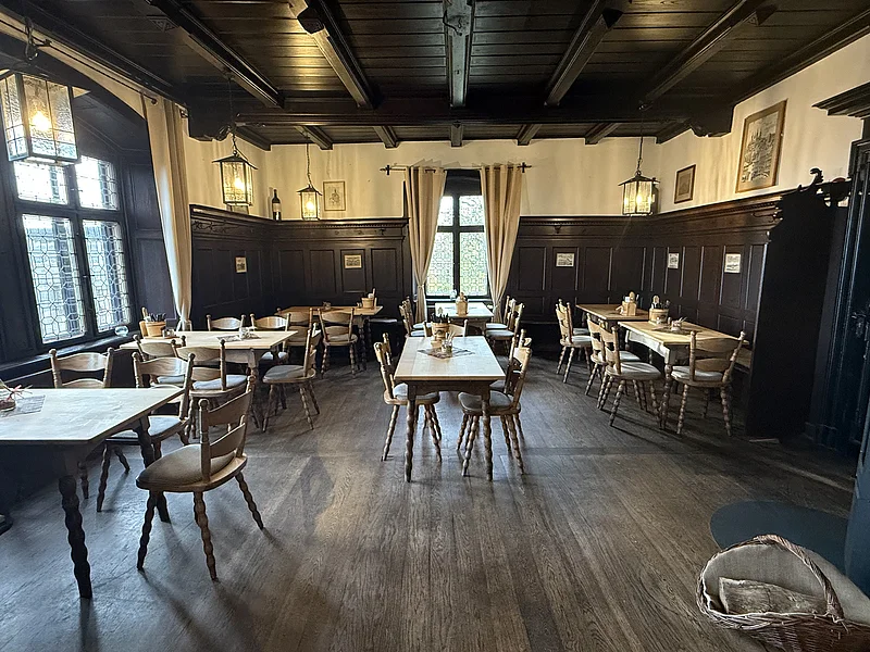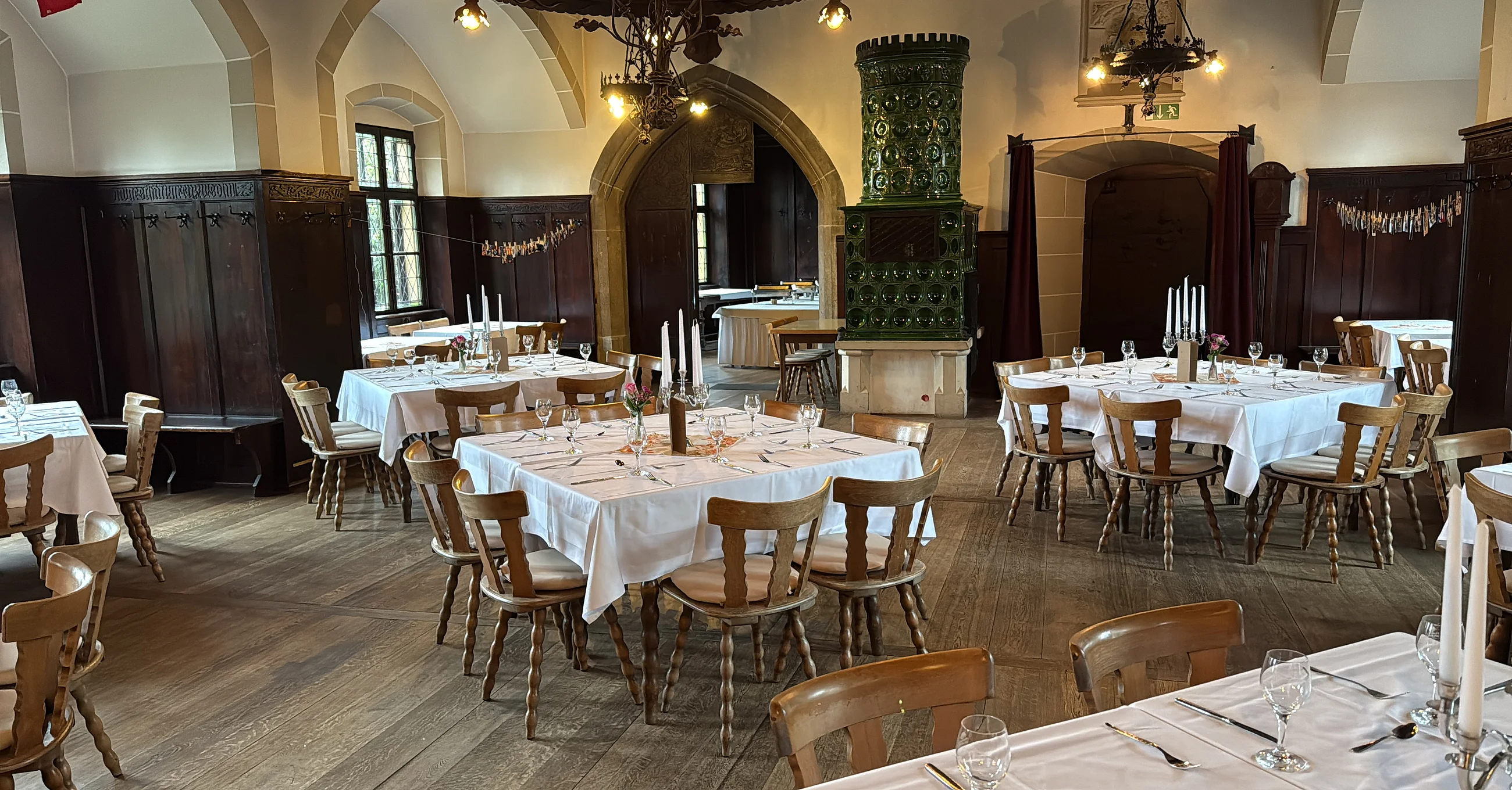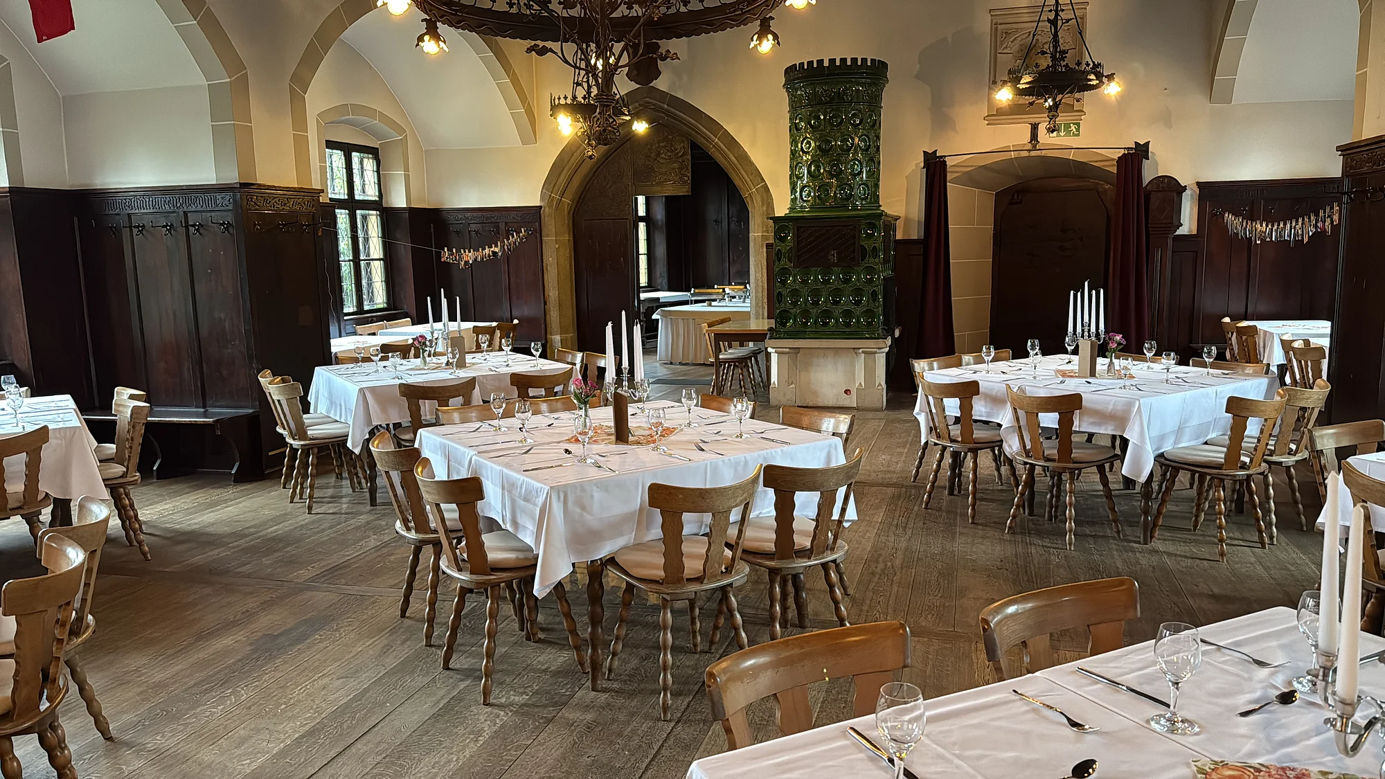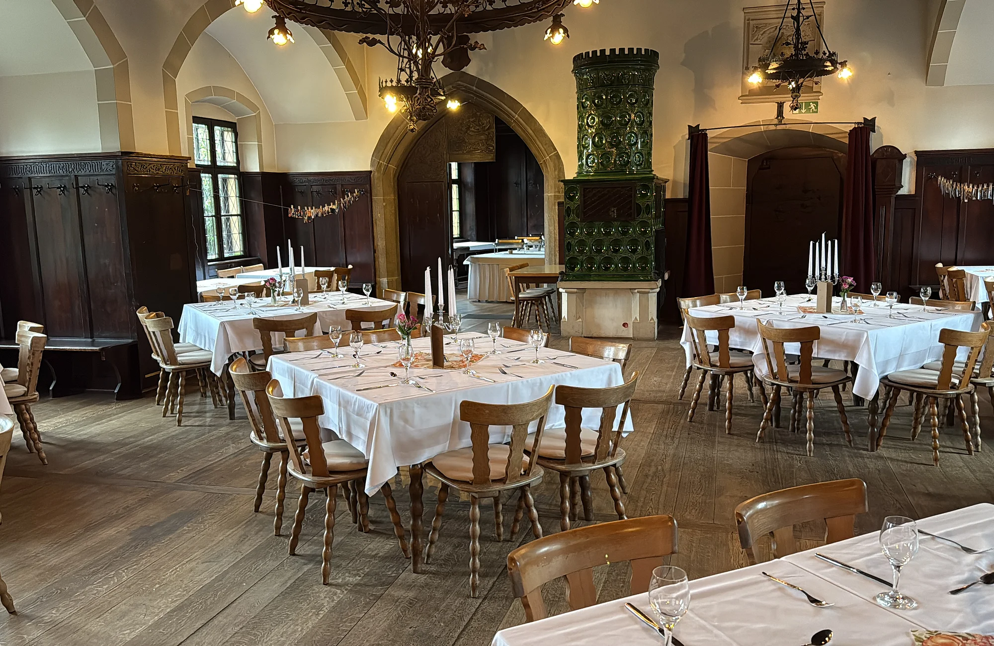 Wood-burning fireplace in the dining room, Knights' Hall with 100 seats
