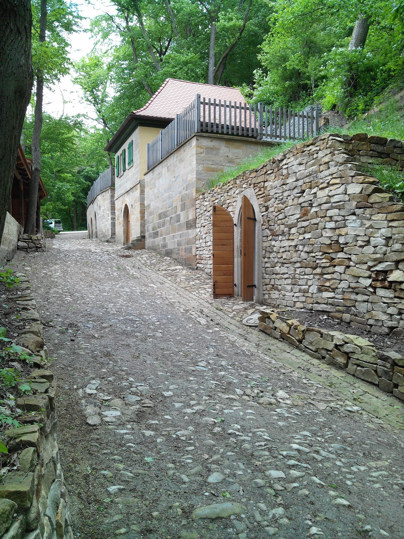 A truly historic and original beer storage cellar complex is the Unterhaider Kelleranlage in Unterhaid, the most eastern wine-growing village producing Franconian speciality wines, just a few miles to the west of Bamberg. It has a total of 29 private cellars and one cellar formerly belonging to a brewery. In the summer months the beer garden cellar is open for the public from 4 pm and serves local beer and food specialities. One of the other cellars is inhabited by several endangered species of bats, another shows the geological foundation of the hill due to an open rock fall.