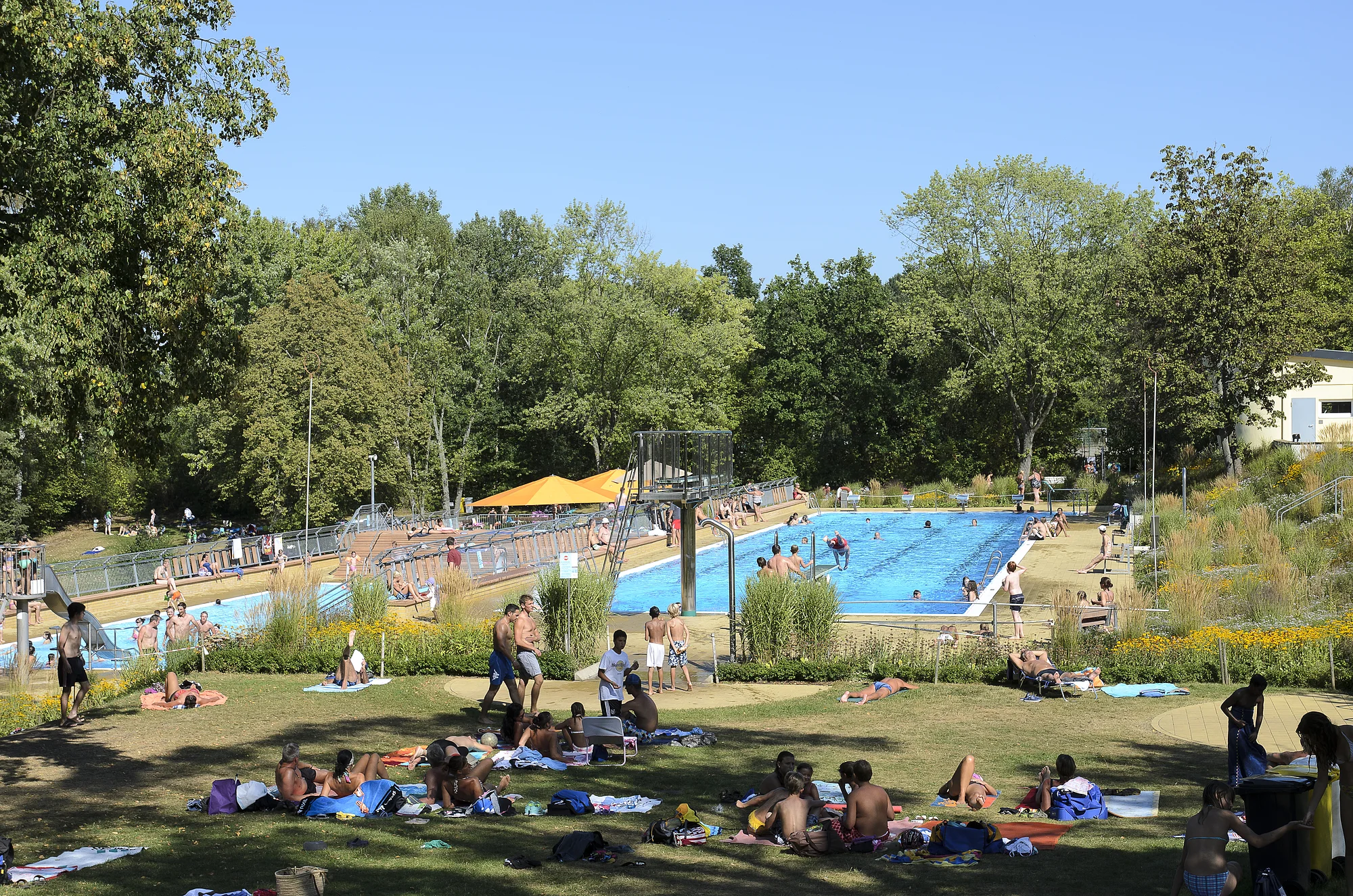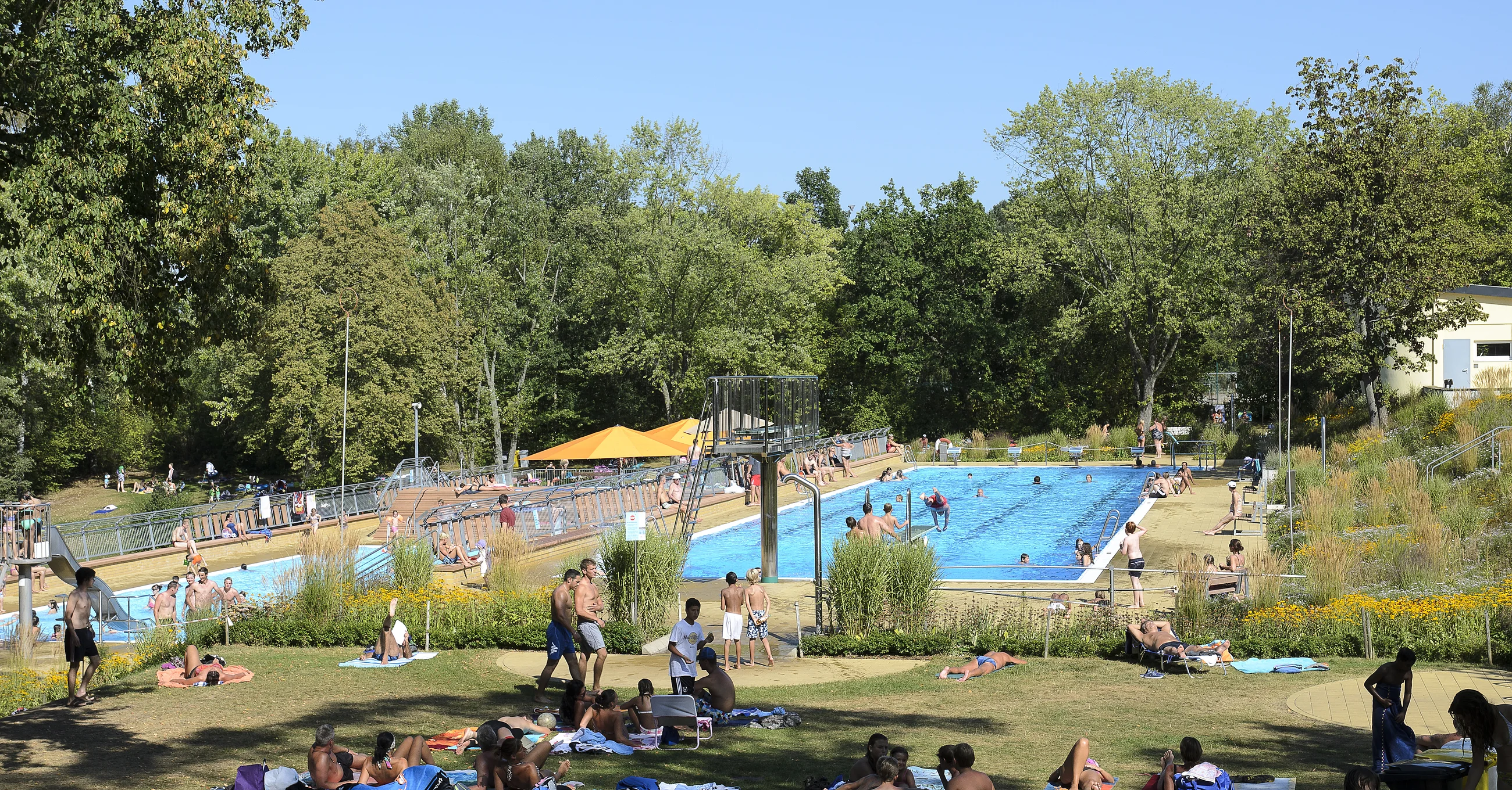 50-meter pools, 3-meter and 1-meter diving platforms, non-swimmers and paddling pools, spacious play area (table tennis, chess, football, basketball), restaurants, events, parking spaces, large sunbathing areas
