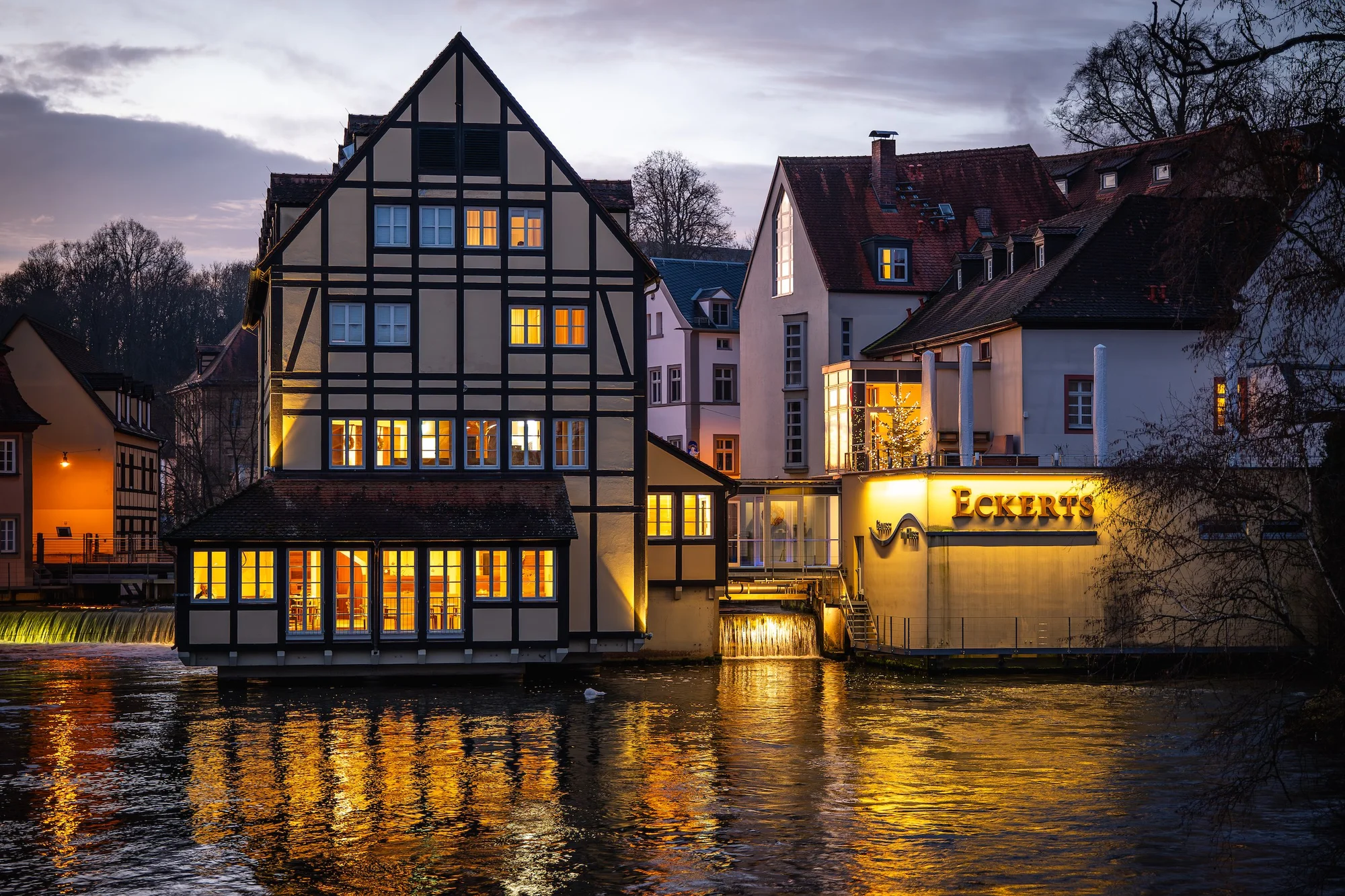 Discover Bamberg from a unique perspective – welcome to the Hotel on the River! Nestled in the heart of the historic mill district, surrounded by the Regnitz River, which even generates our green electricity, lies the Hotel Nepomuk. Here, you're surrounded by Little Venice and the historic town hall, just steps away from the picturesque lanes of the UNESCO World Heritage Old Town. Our hotel offers everything you need for a perfect stay: a personalized à la carte breakfast, lunch specials, coffee and homemade cakes, and a cozy dinner in our in-house ECKERTS Wirtshaus, where you can enjoy Franconian-inspired cuisine with handcrafted dishes and regional ingredients. Each of our unique rooms offers a special view of Bamberg's picturesque ensemble. Experience the enchanting scenery of Bamberg – we look forward to welcoming you!