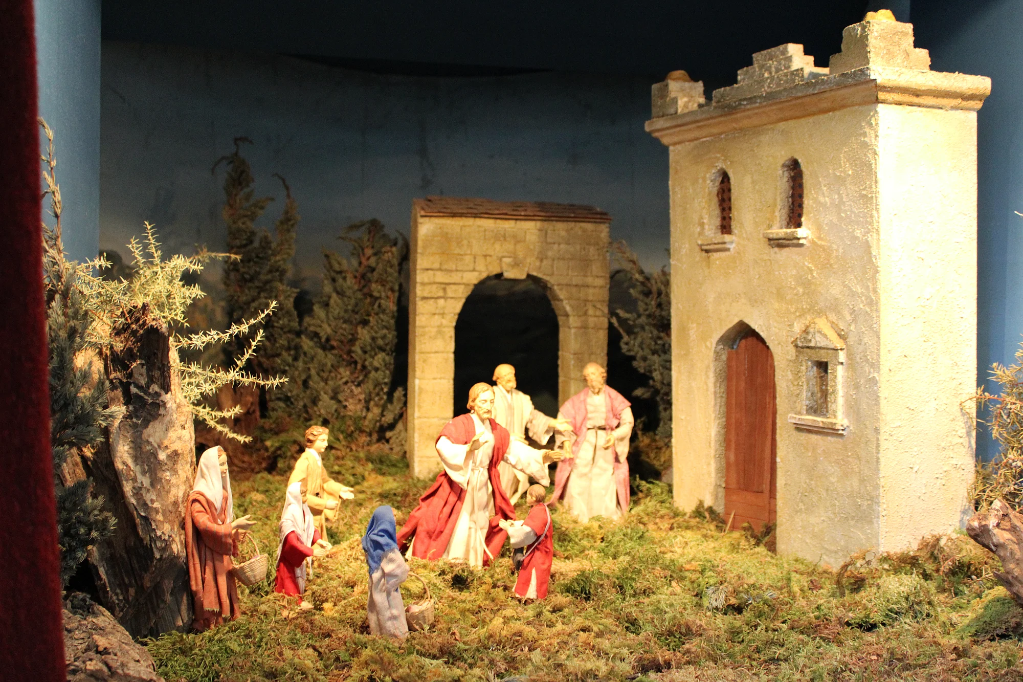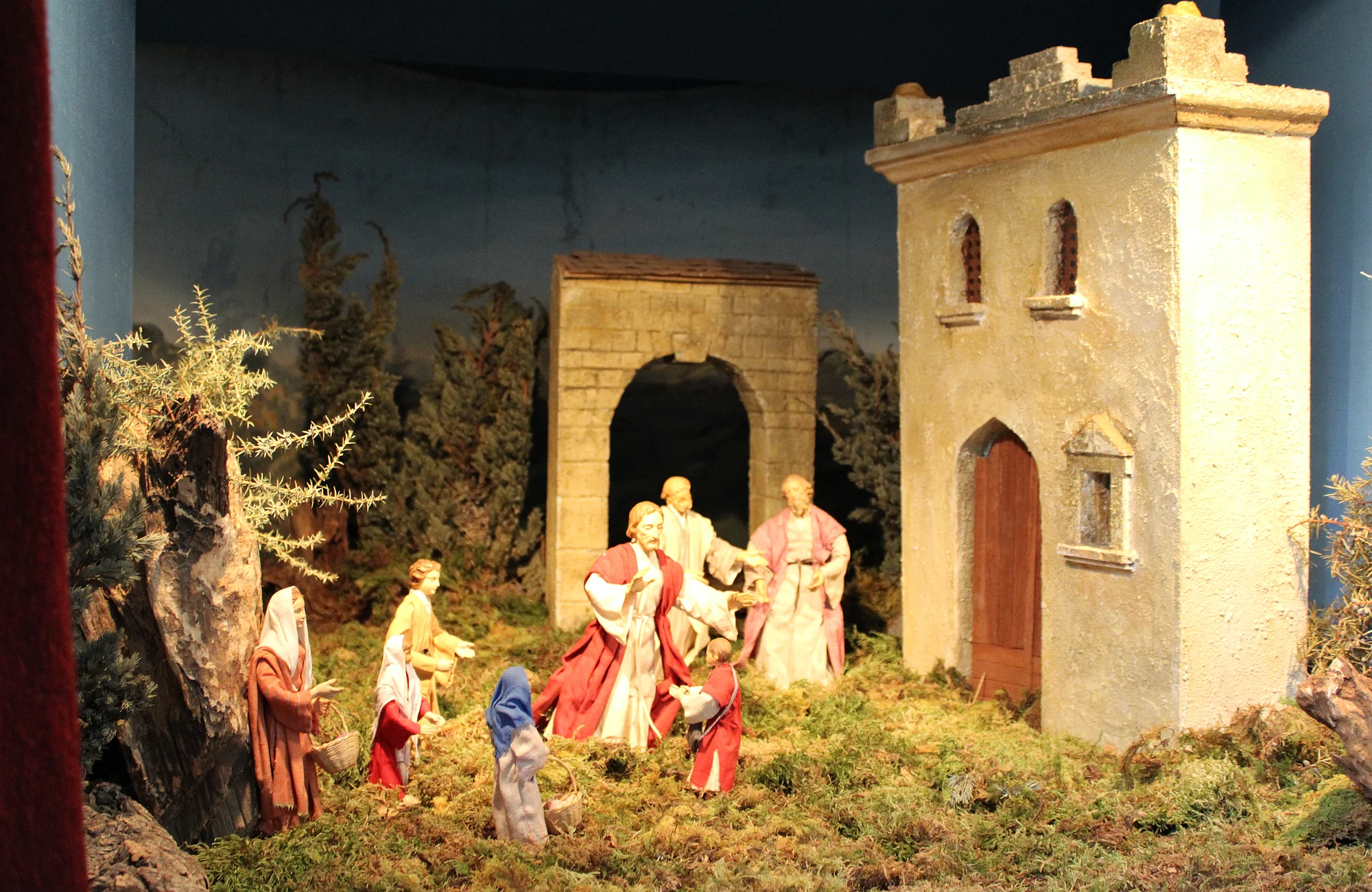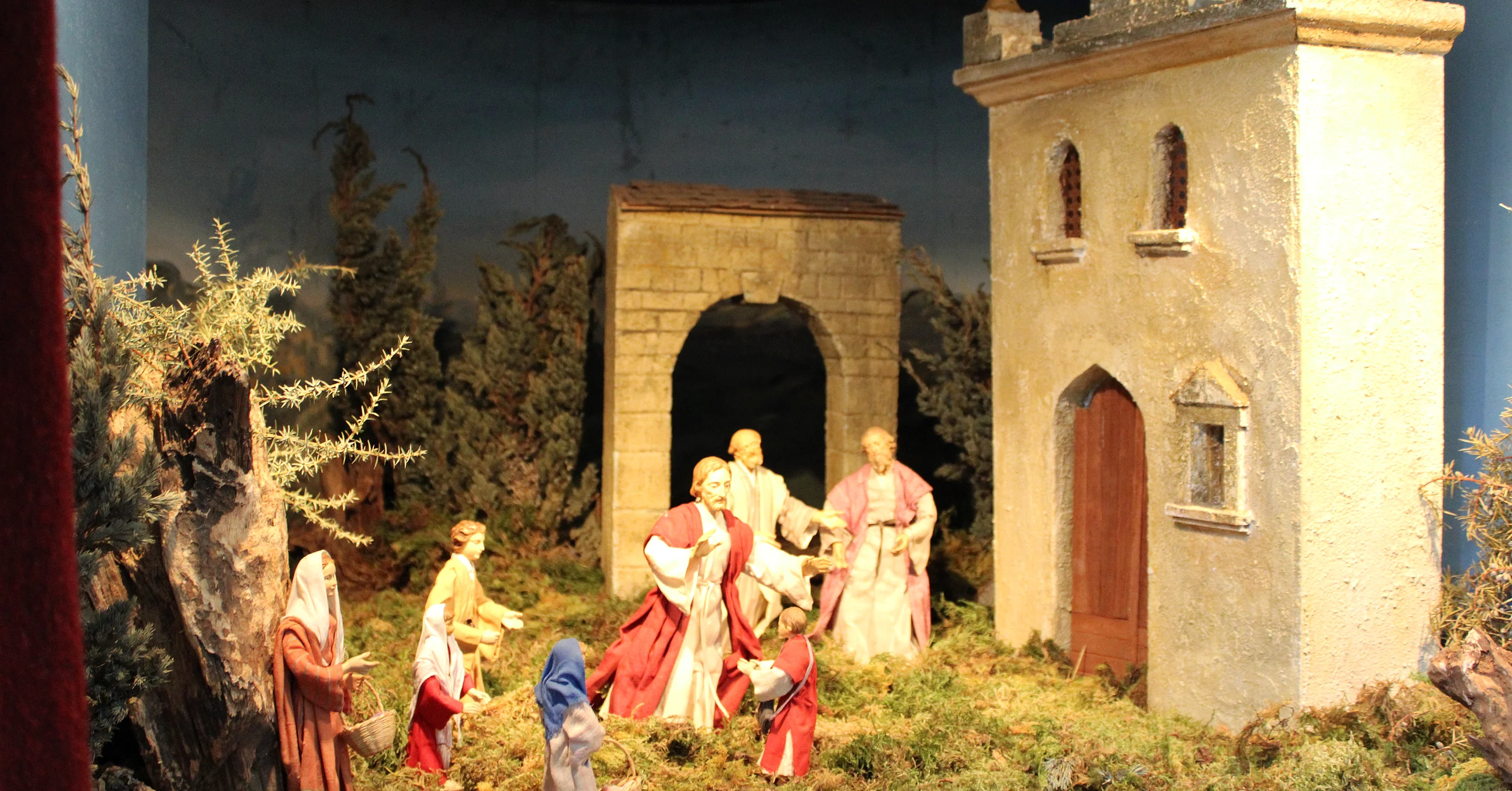 The oriental nativity scene featuring carved wood and clothed figurines is a year-round presentation.
