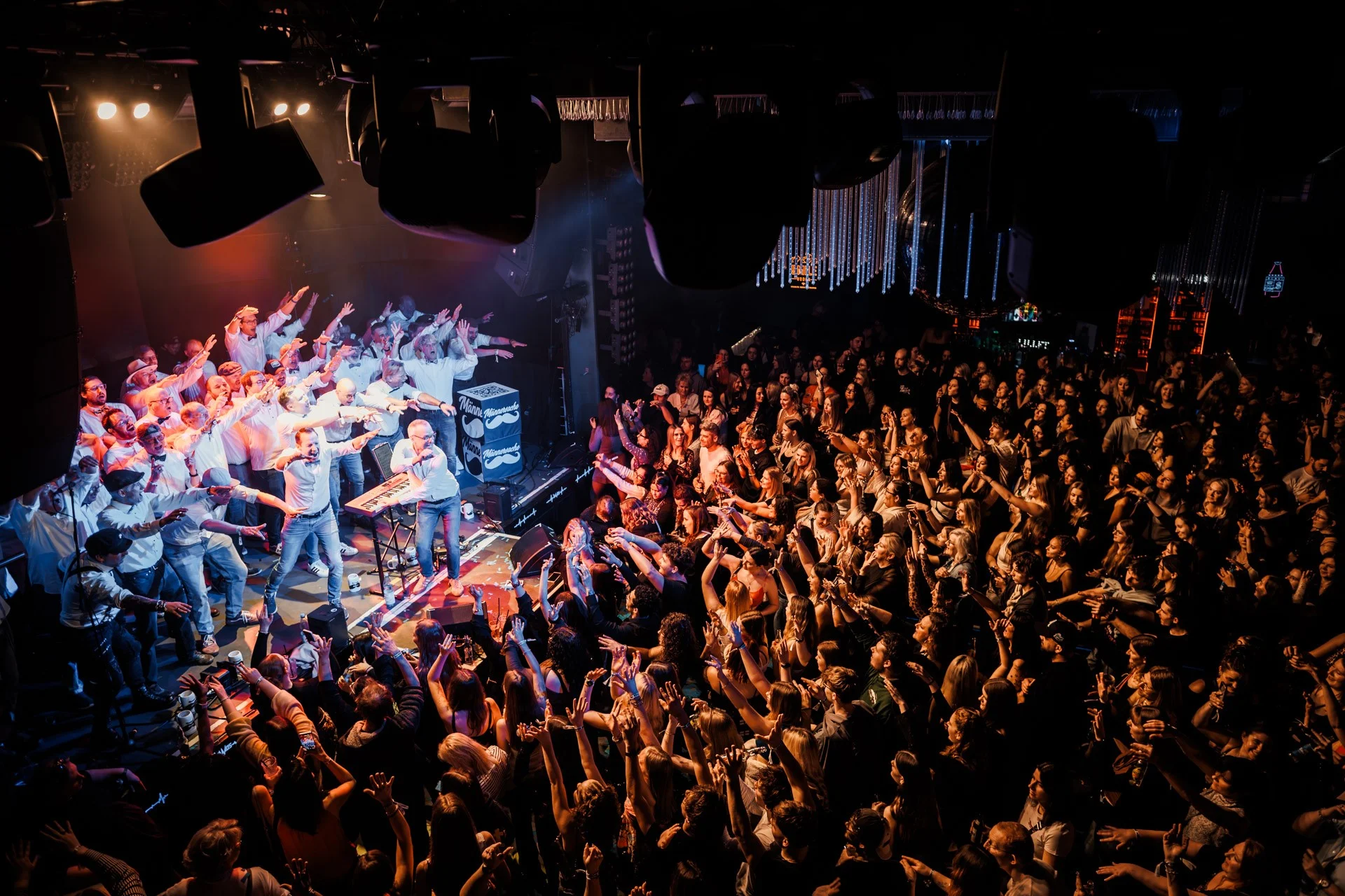 The choir usually sings unamplified, relying on the sheer power of 40 to 60 men on stage, and has already thrilled audiences of nearly 1,500 as the opening act for the American entertainer Jason Derulo. The choir seeks a close connection with its audience and uses this connection to create high-energy performances – around 30 shows a year, each lasting up to two hours – featuring a repertoire of German and English pop, rock, and Schlager songs.