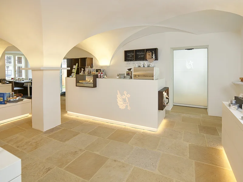There is also a small café in the shop, serving coffee variations, fairtrade coffee roasted in Franconia, homemade cakes, wine and sparking wine from the vineyard below St. Michaels'.