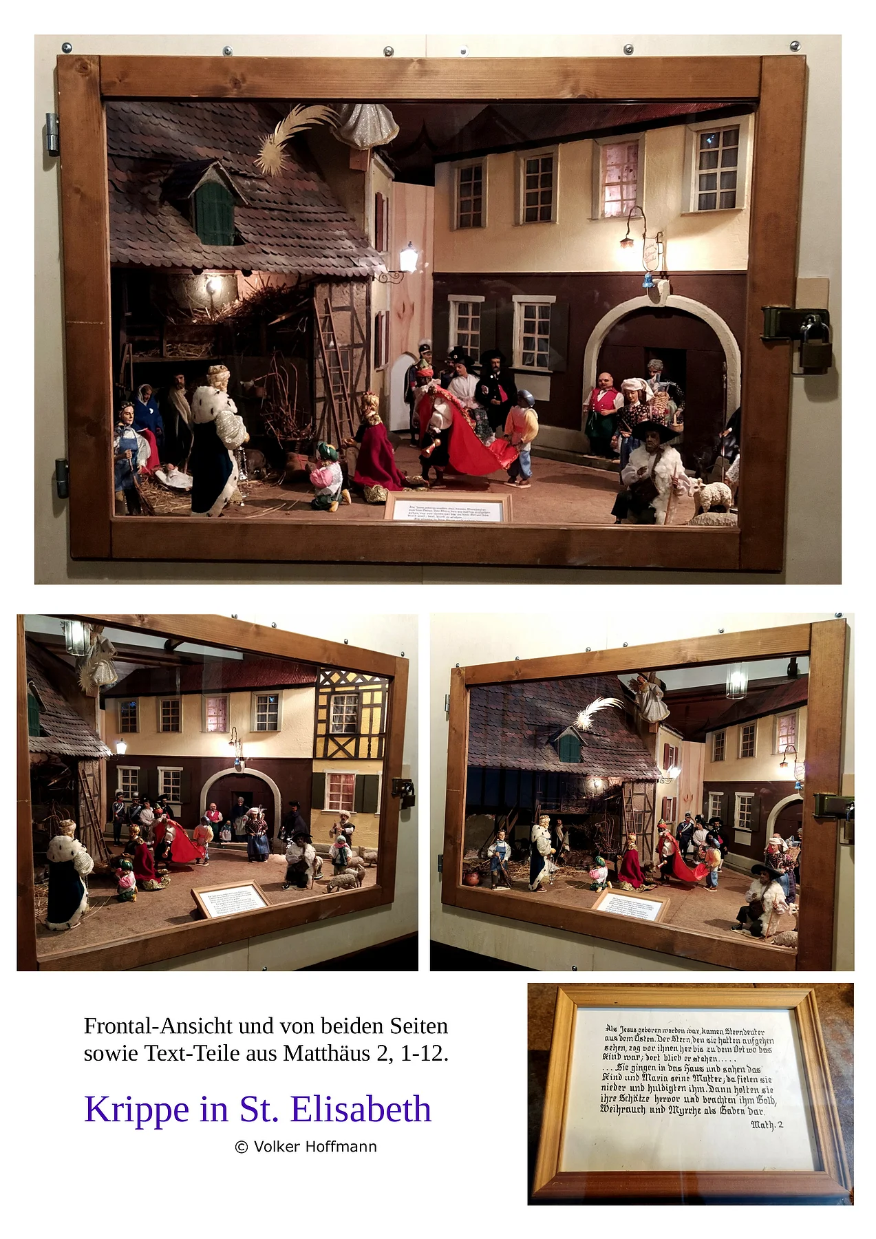 Bei geöffneter Tür ist die Krippe auch zu anderen Zeiten zu besichtigen, denn sie befindet sich vor dem Absperrgitter zum Kirchen-Innenraum: Illumination der Szenen per Lichtschalter mit Schaltuhr.