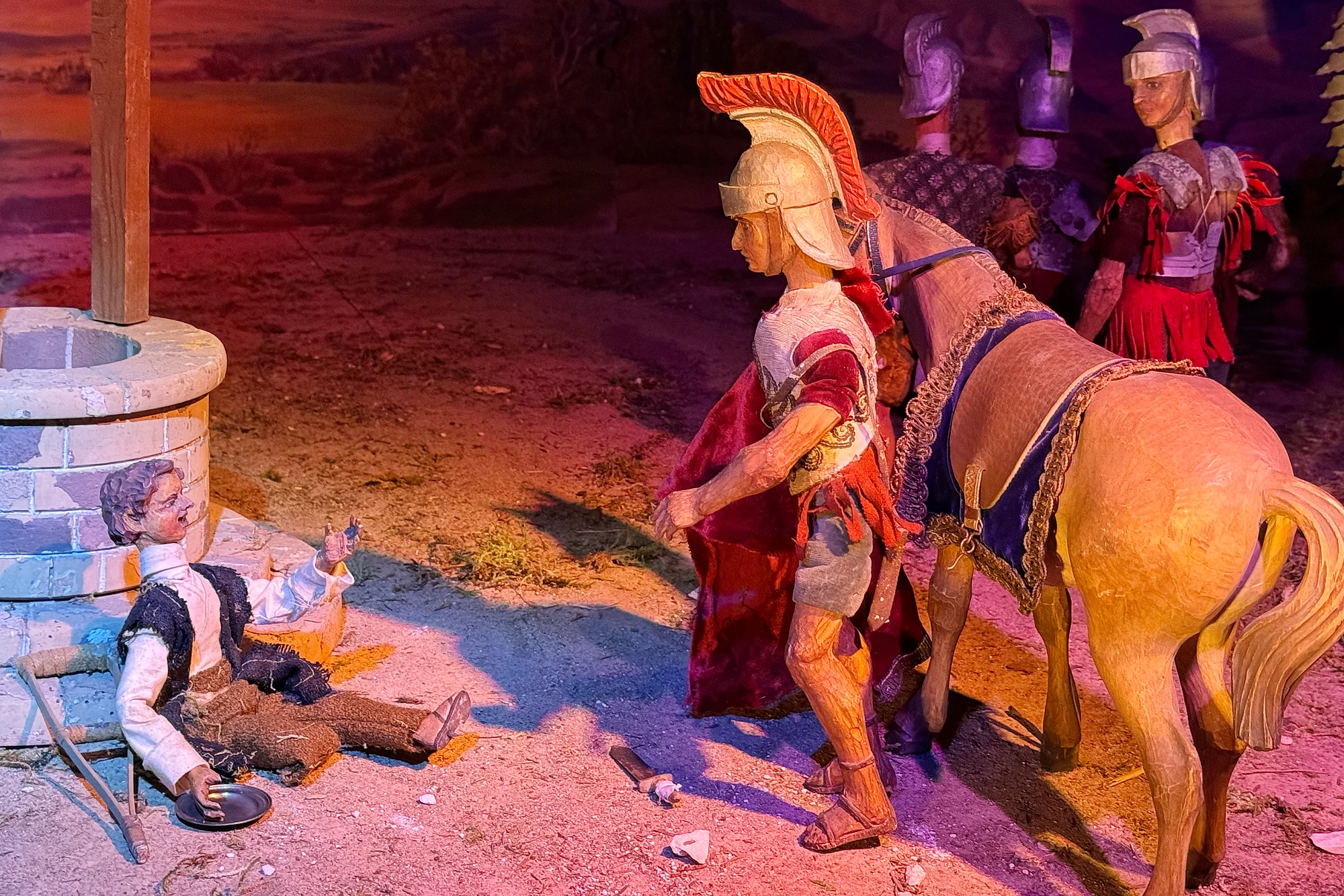 The cabinet nativity scene, situated in the left spire, contains jointed figures made in the 18th till 20th centuries.