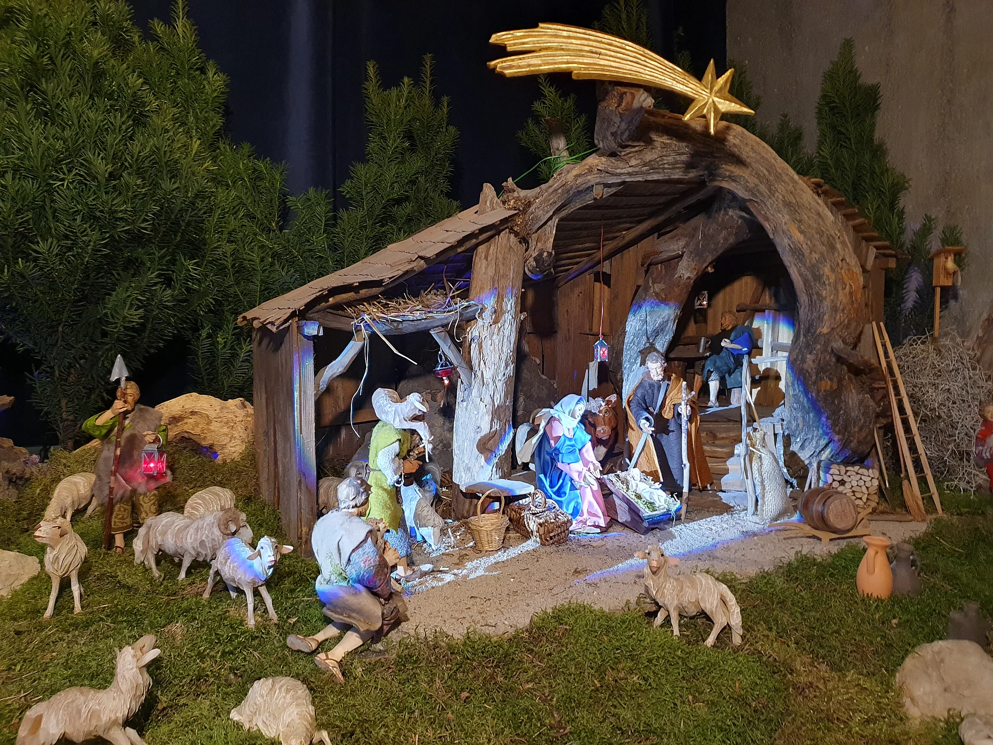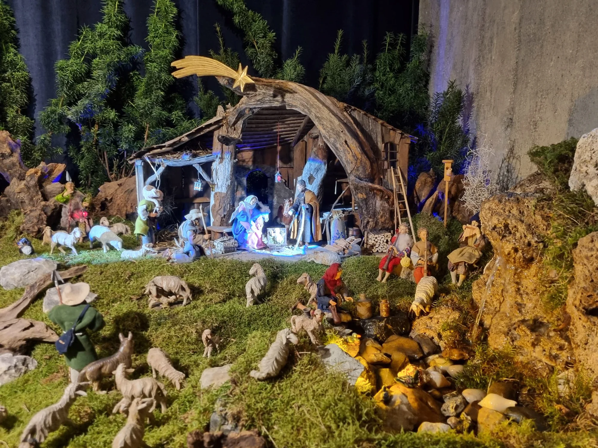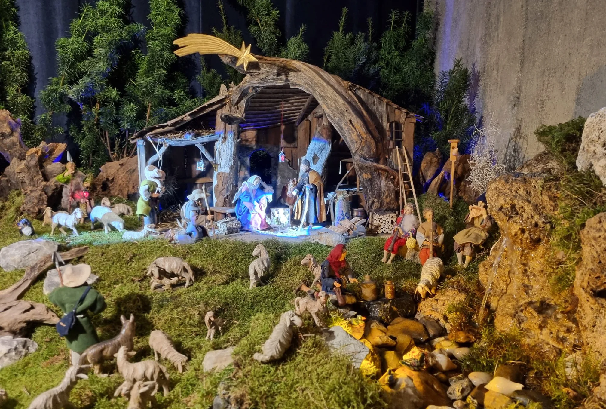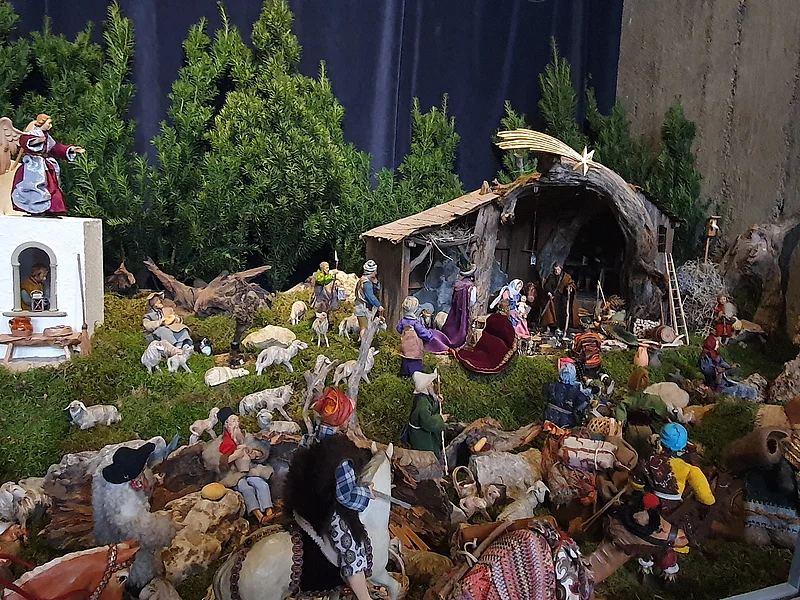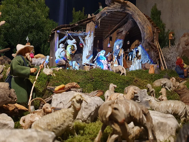 The nativity scene is a beautiful and realistic display. The water flowing down the rockface is a special attraction for children.