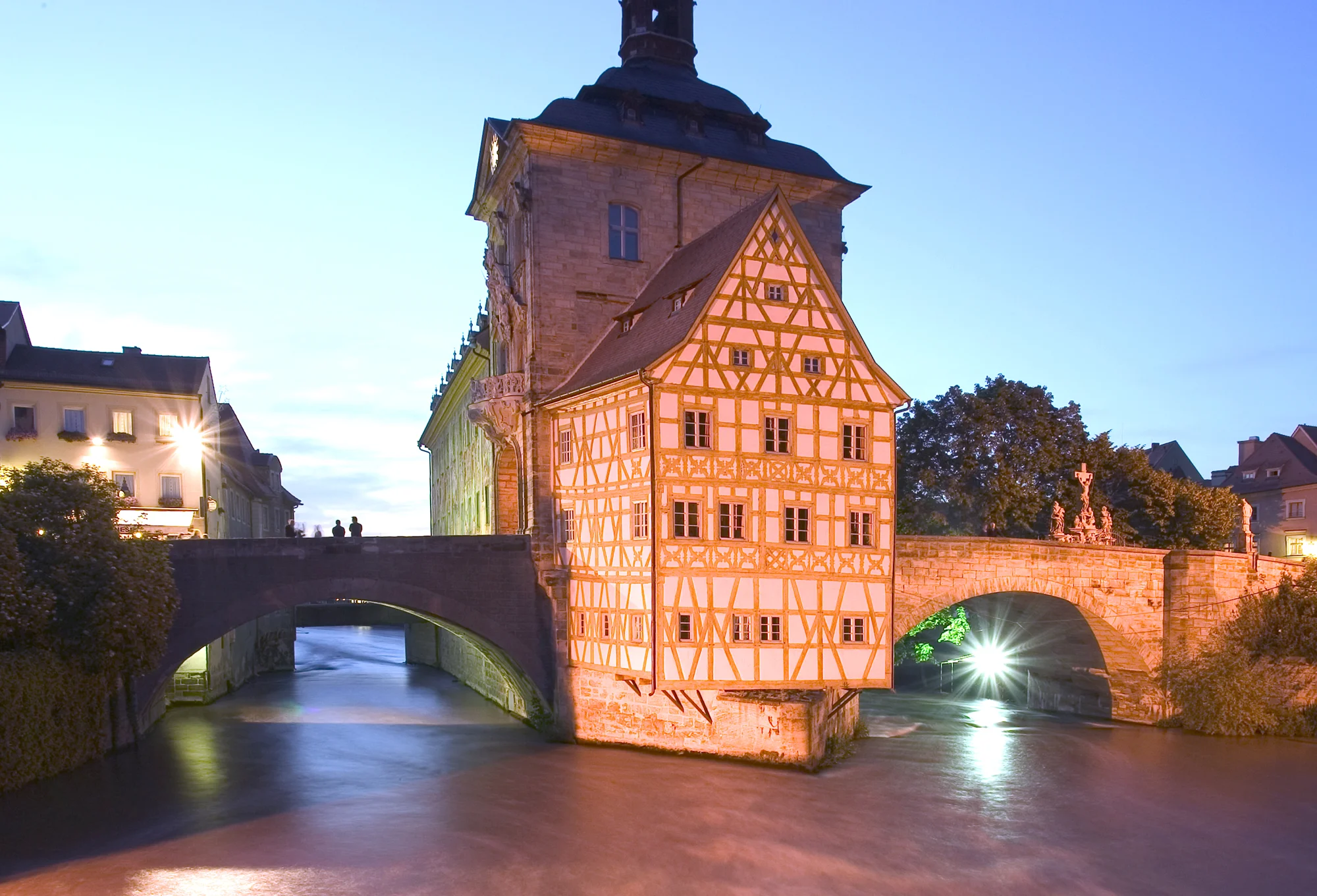 According to legend the bishop of Bamberg did not grant the citizens any land for the construction of a town hall. This prompted the townsfolk to ram stakes into the river Regnitz to create an artificial island, on which they built the town hall they so badly wanted.