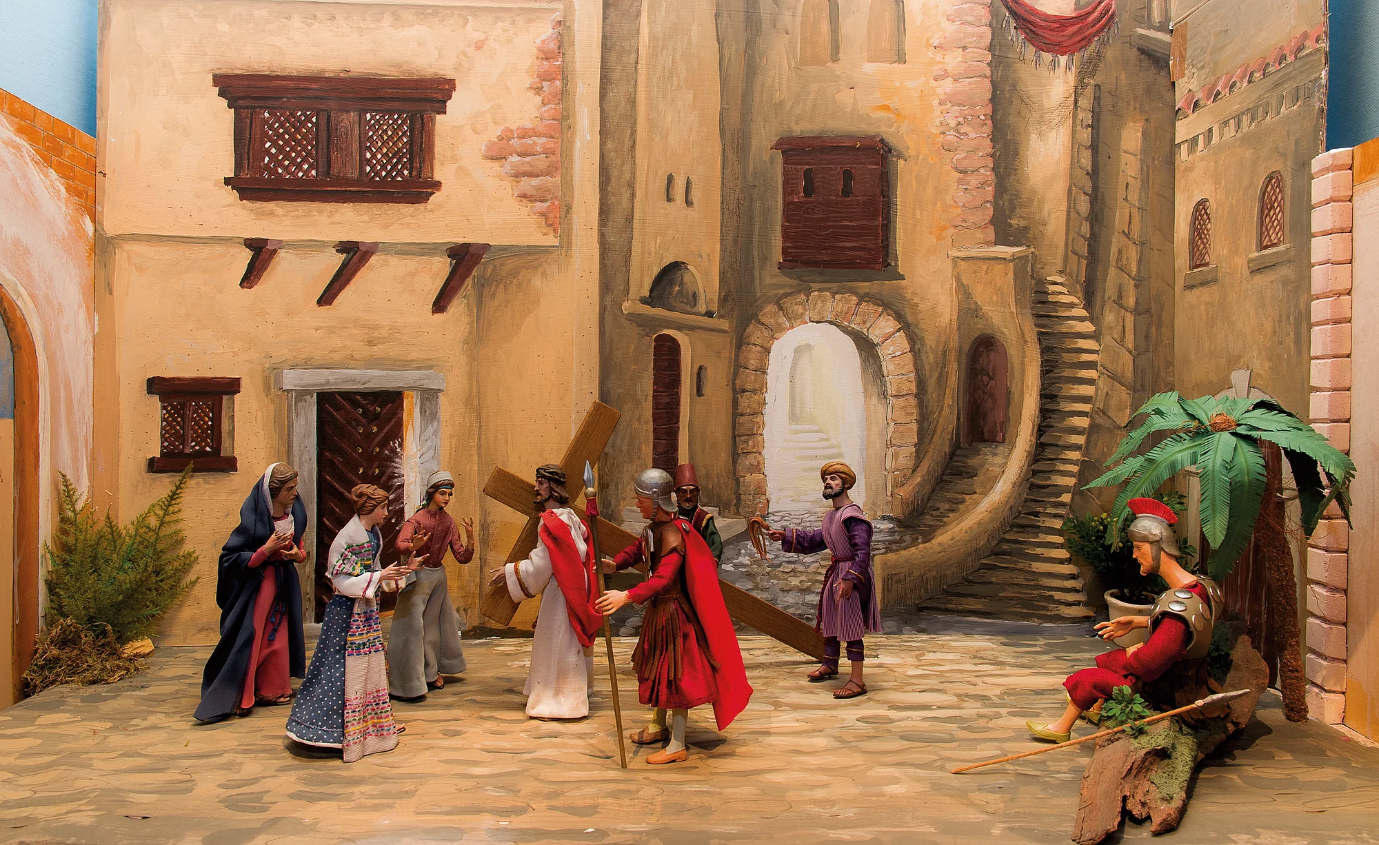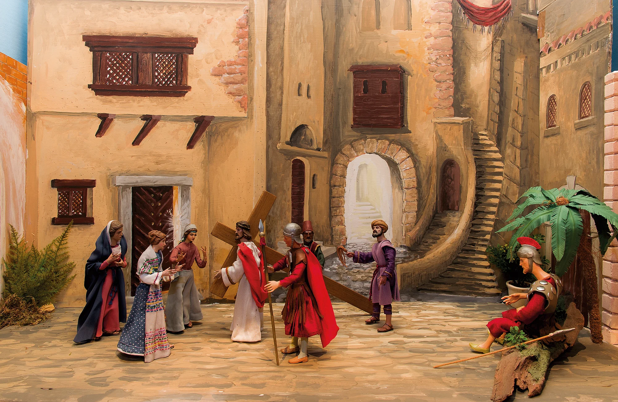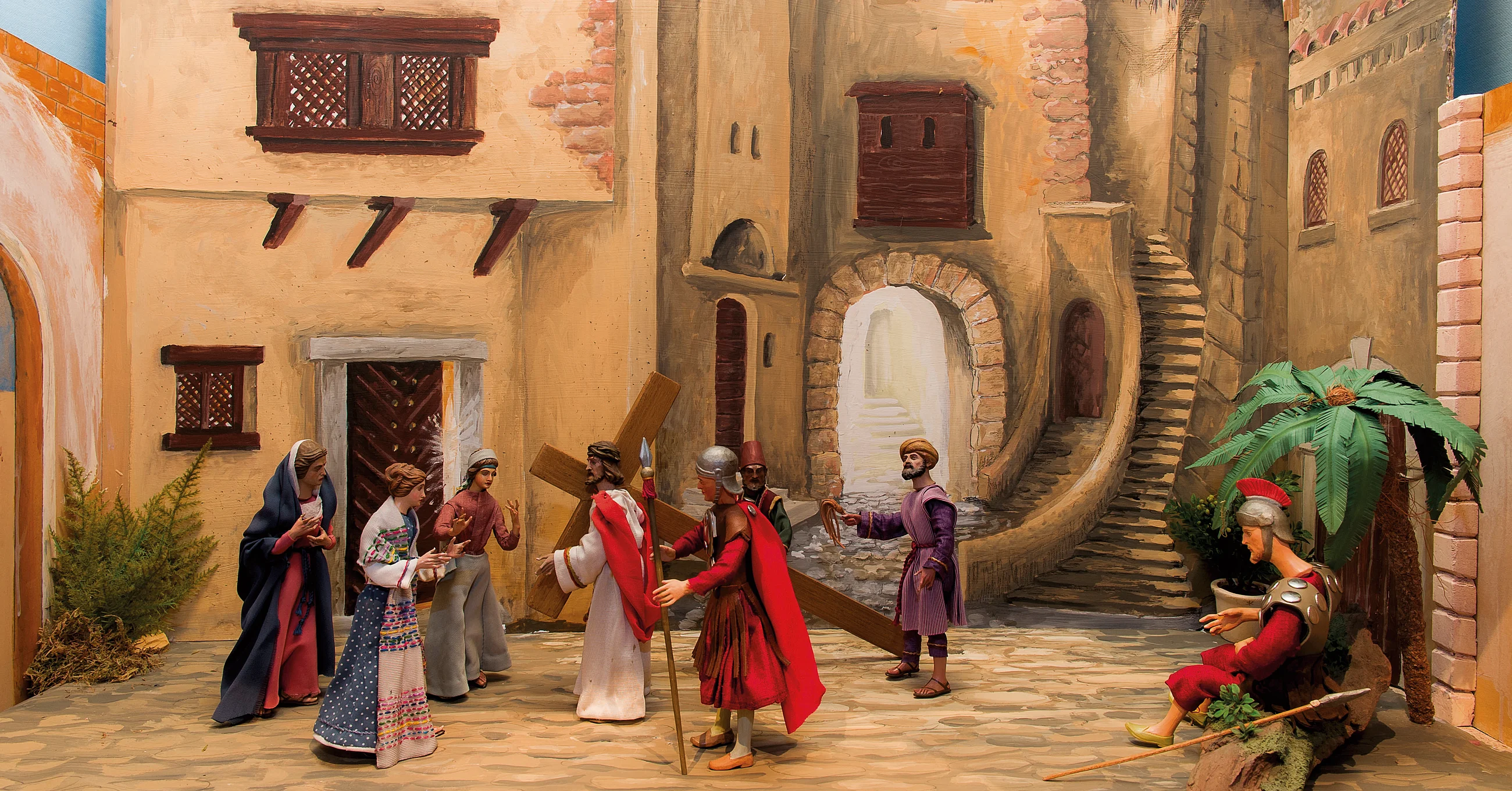 The Passion cribs, also known as the "earnest cribs" show Jesus' passion in the form of cribs during Lent. In the run-up to Easter these cribs depict scenes from Jesus' entry into Jerusalem, the passion of Christ, crucifixion, and resurrection.
