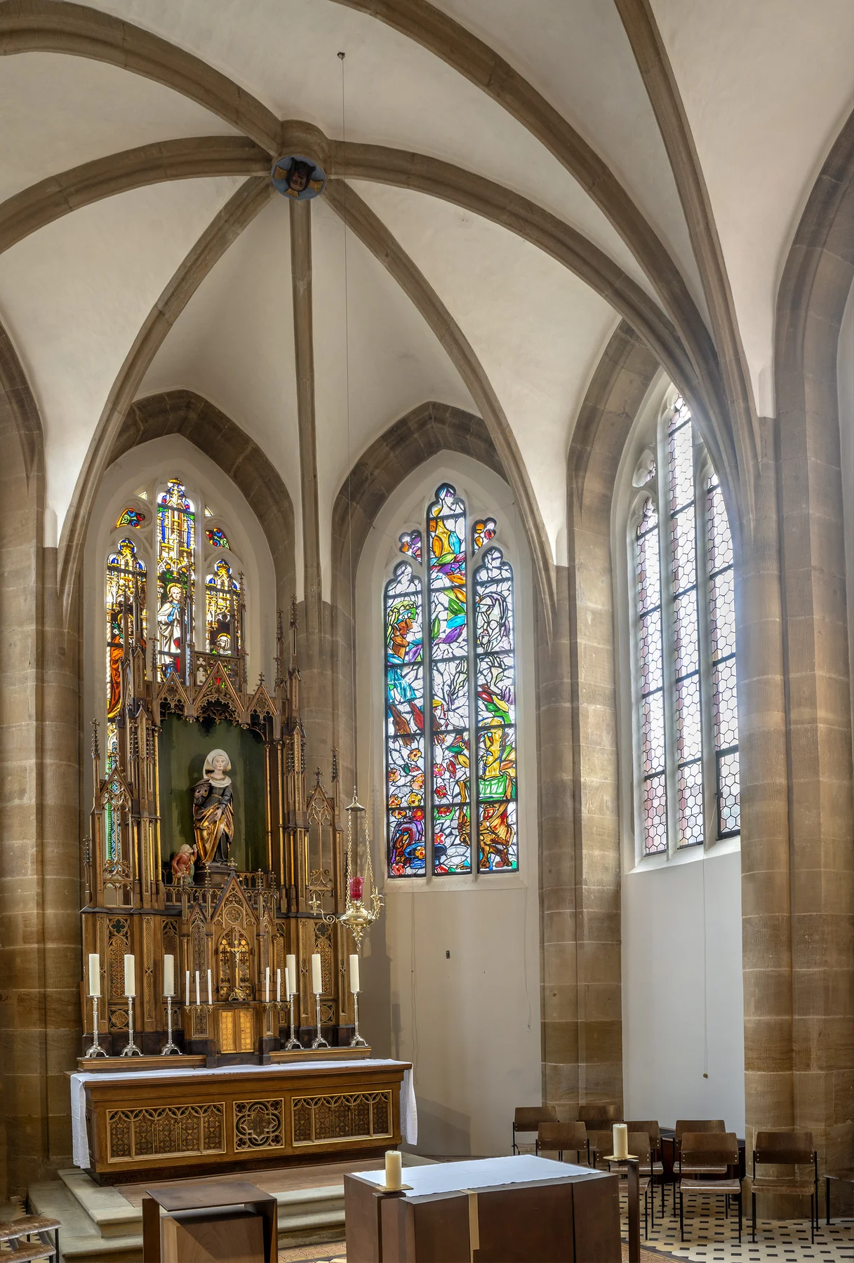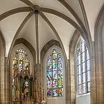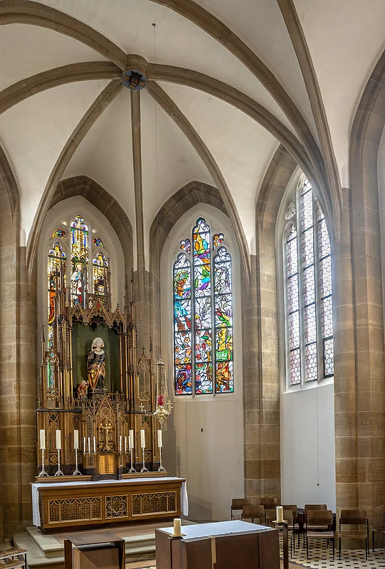 The church is now a highlight for lovers of contemporary art, as the German artist Markus Lüpertz has designed and created eight stained-glass windows for the church, depicting the legend of Holy Elisabeth and the seven works of mercy. Lüpertz' art is already present in front of the church with his statue „Apoll“.
