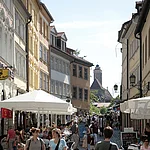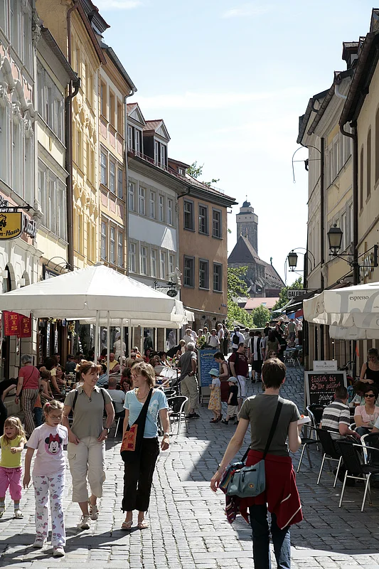 The Island City is the old "bourgeois" merchant city and is now Bamberg's centre. In the pedestrian zone and beyond, we find what has become a rare retail landscape which is characterised by small, privately run stores in historical buildings, beautiful shops for browsing and, of course, an extensive selection of large chain stores and trend labels. The restaurants cover everything from student-style eateries to traditional, wood panelled inns, from traditional Franconian cooking to haute cuisine. The daily market offers regional products from the local market gardens in and around Bamberg. As a university town the Island City is home to several important educational institutions such as the Faculties of Humanities belonging to the Otto-Friedrich University and several schools. Student life is also a major part of the Island City, and is concentrated, above all, in Austraße, which is lined with cafés and shops with a diversity of products. The Island city is still full of residents who love life in the city centre.