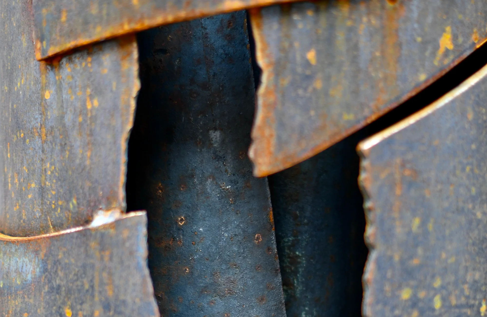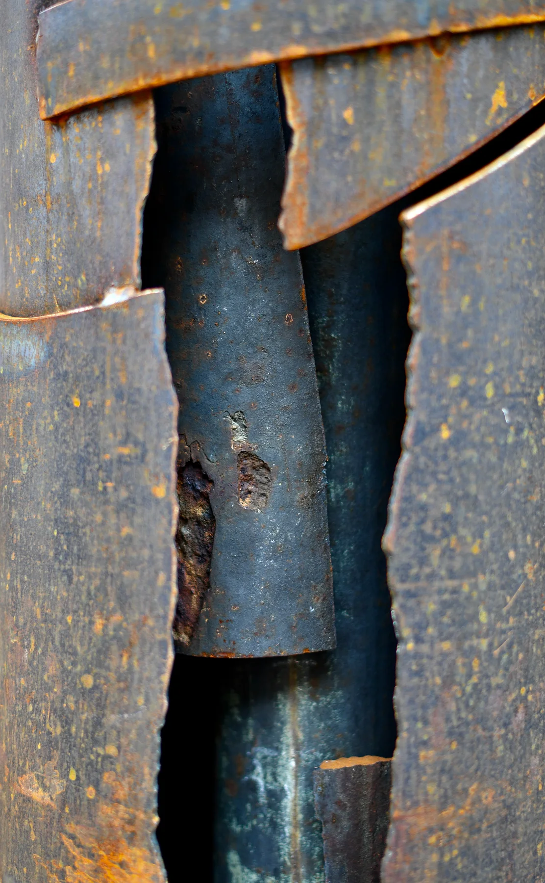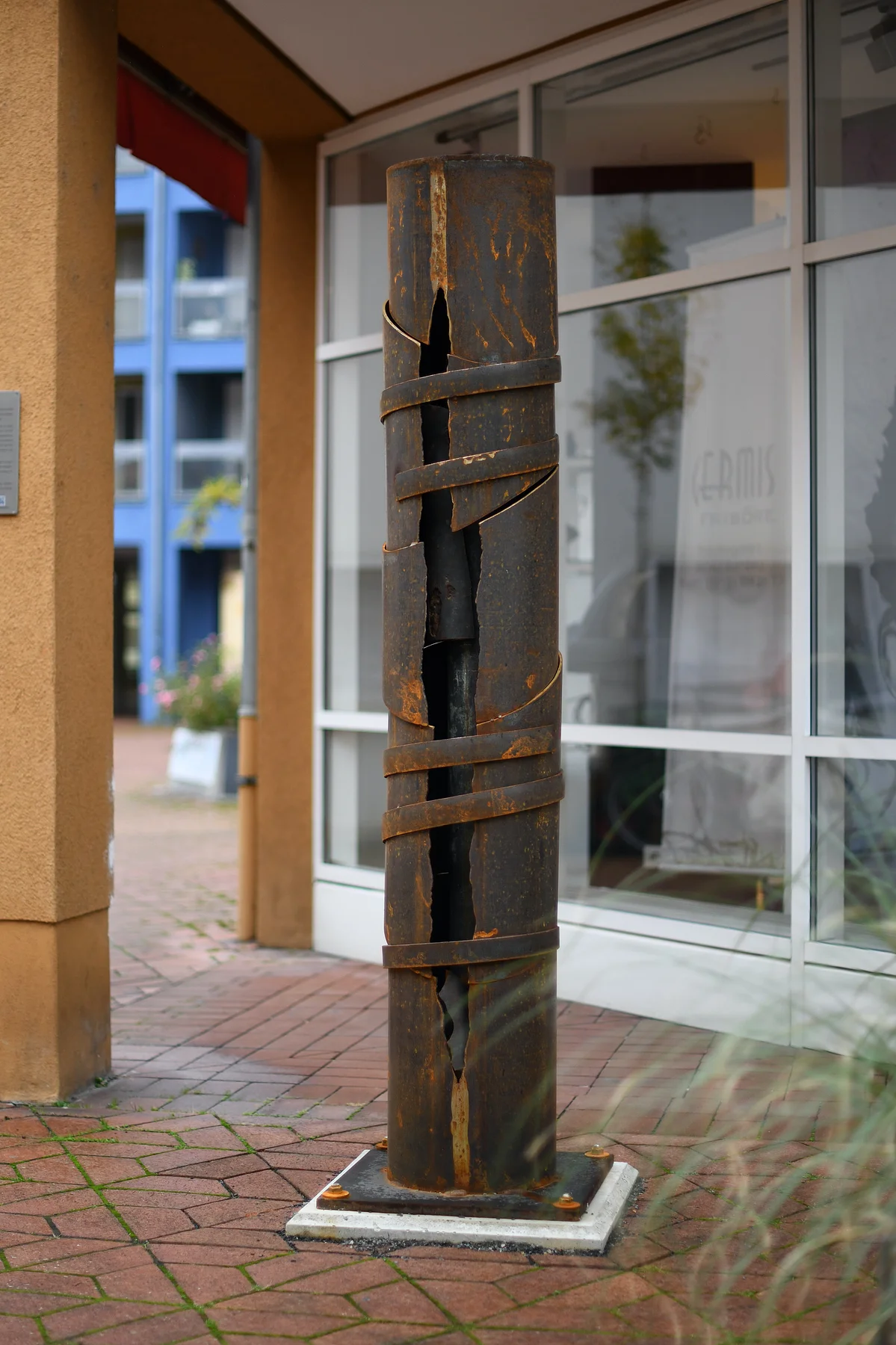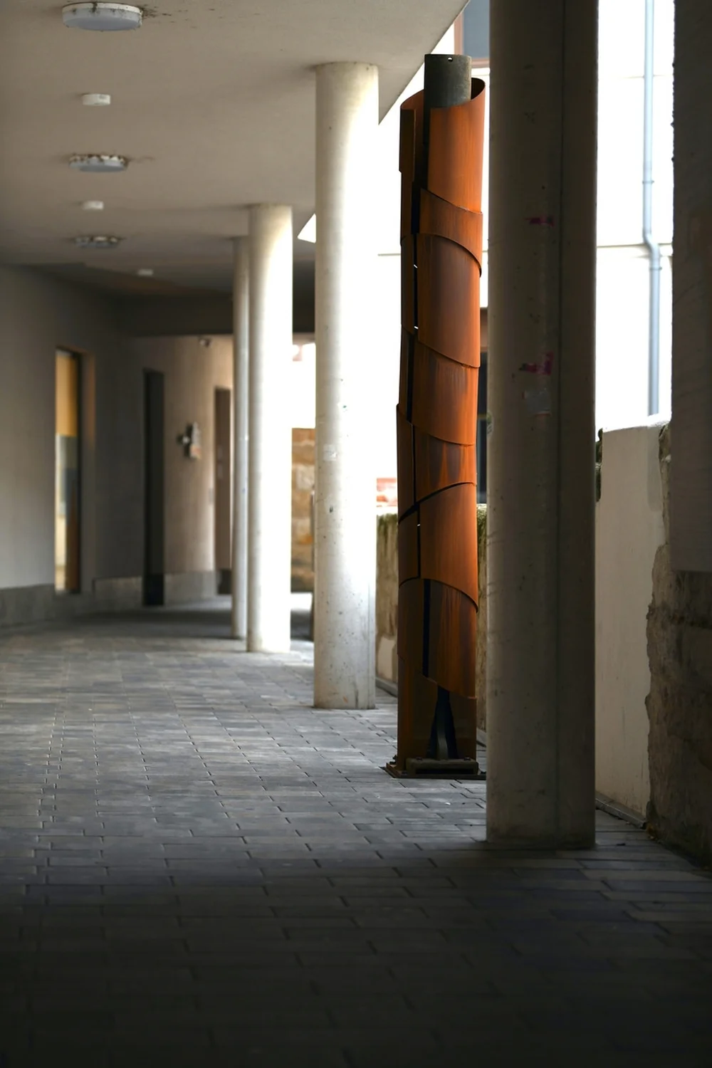 The historic cast iron columns originate from the sewing silk factory Kupfer, Heßlein & Co. and served as free-standing columns in the factory halls. They are the soul of the artworks. Artist Bernd Wagenhäuser encased them in Cor-Ten steel to give the columns support.