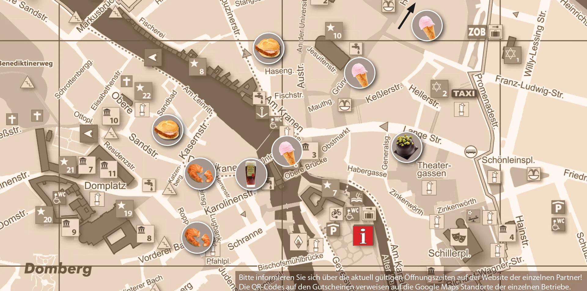 • QR-Codes auf dem Gutschein führen dich direkt zu den Einträgen der Partner auf Google Maps