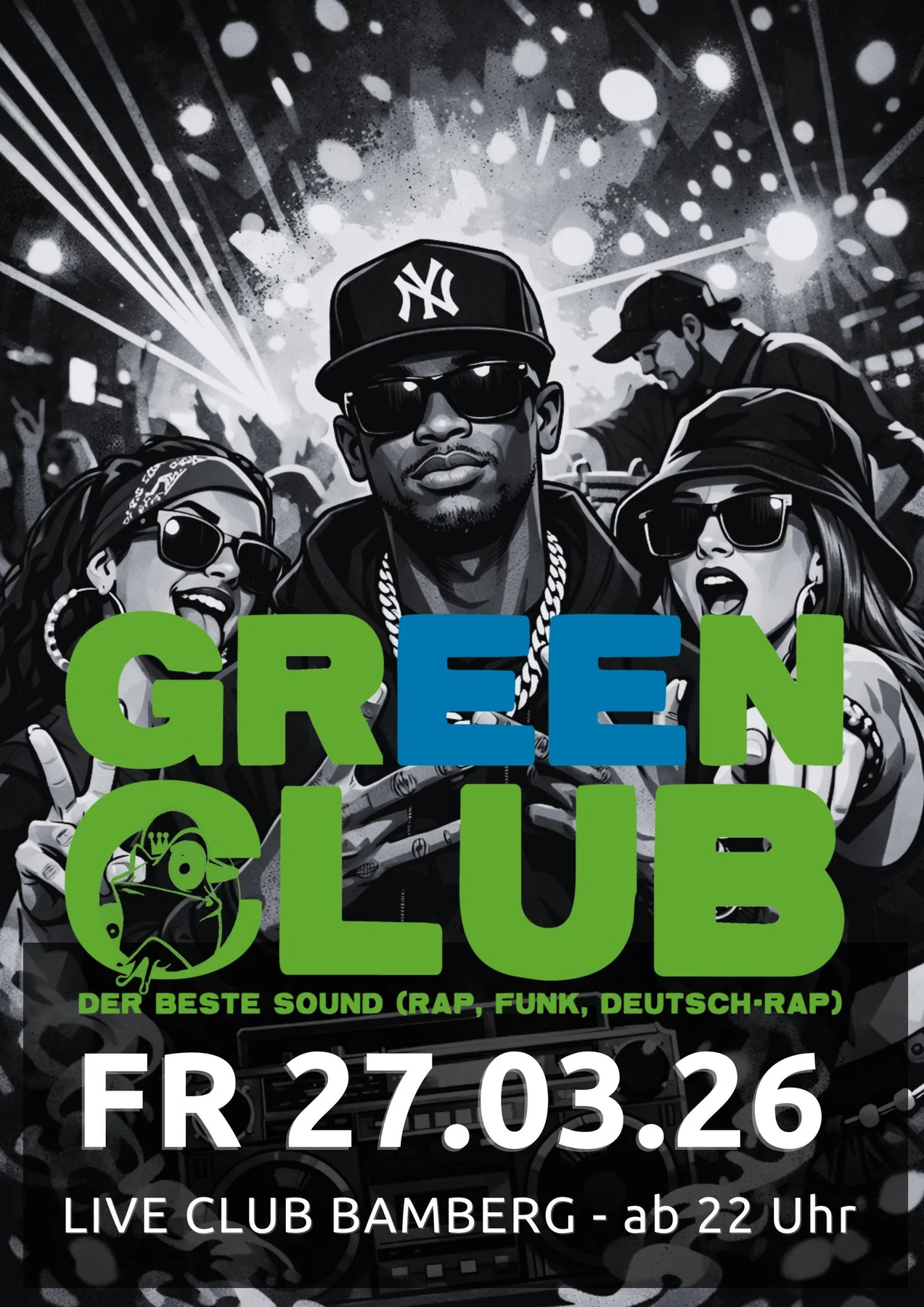 Bamberg, es ist wieder soweit! Der Greenclub ist zurück und bringt euch den bewährten Mix aus Hip-Hop, Rap, Funk & Deutschrap – genau die Energie, die ein Freitagabend braucht.