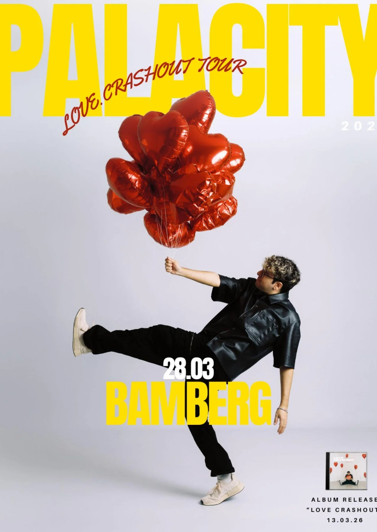 Nach der EP The Strays (2024) startet Palacity 2026 ins nächste Kapitel: Im März erscheint das neue Album „Love Crashout“, begleitet von einer Deutschlandtour mit Finale am 28.3. in der Heimat Bamberg. Freut euch auf neue Songs, starke Emotionen und pure Feelgood-Energy auf der Bühne!