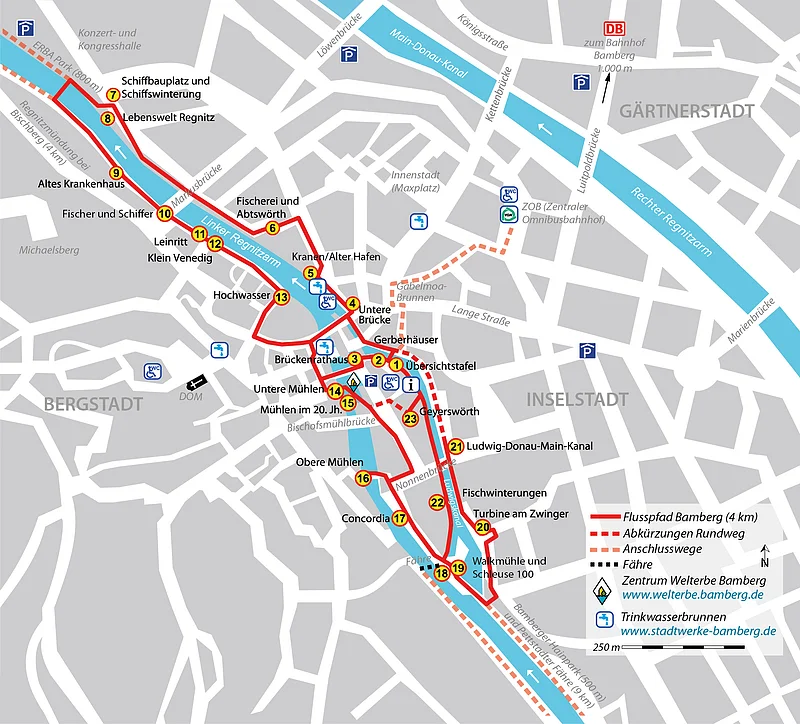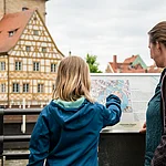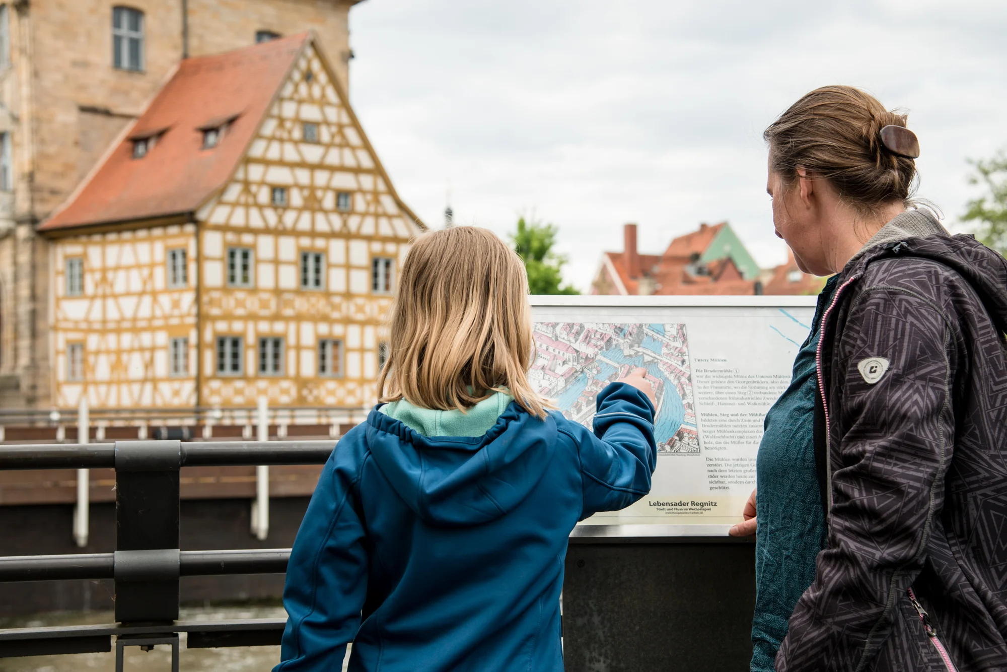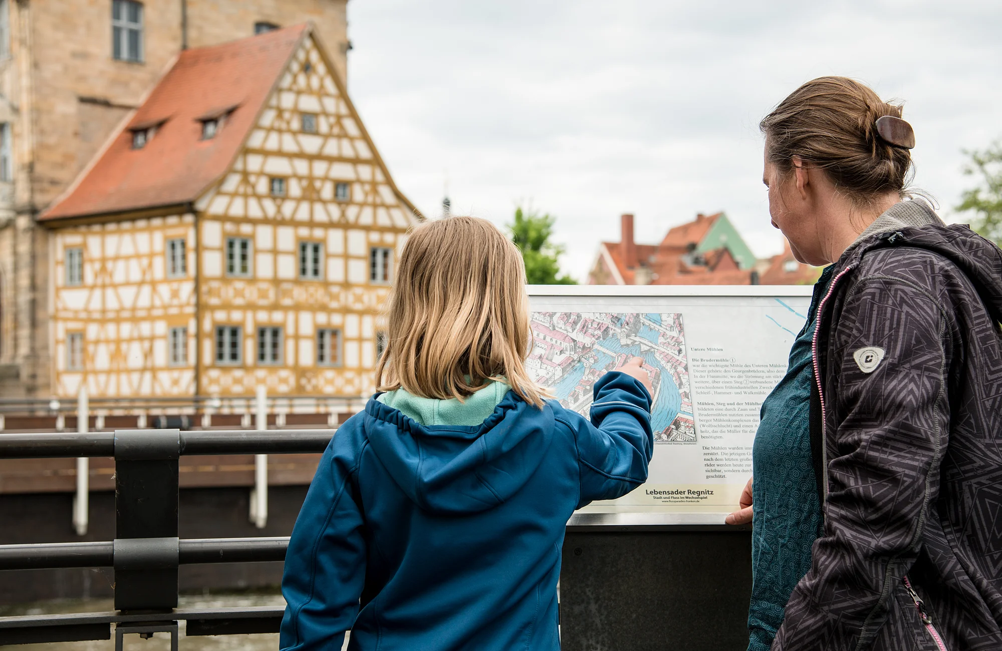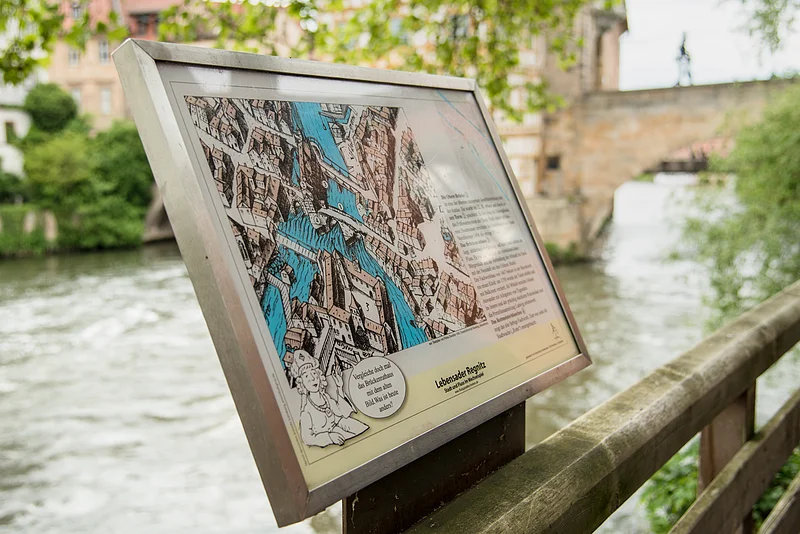 Along the Regnitz, the history of the World Heritage City of Bamberg can be discovered from a particularly appealing perspective. The river path Bamberg illustrates well-known and concealed places near the water with short texts and historical depictions on 23 tablets (in German). The path concerns the life of the fishermen, the meaning of the mills and also explains why there are iron cranes located near the Regnitz. At every station, a drawn figure of Kunigunde poses an exciting question that can be solved by children and adults together. The path is suitable for buggies.