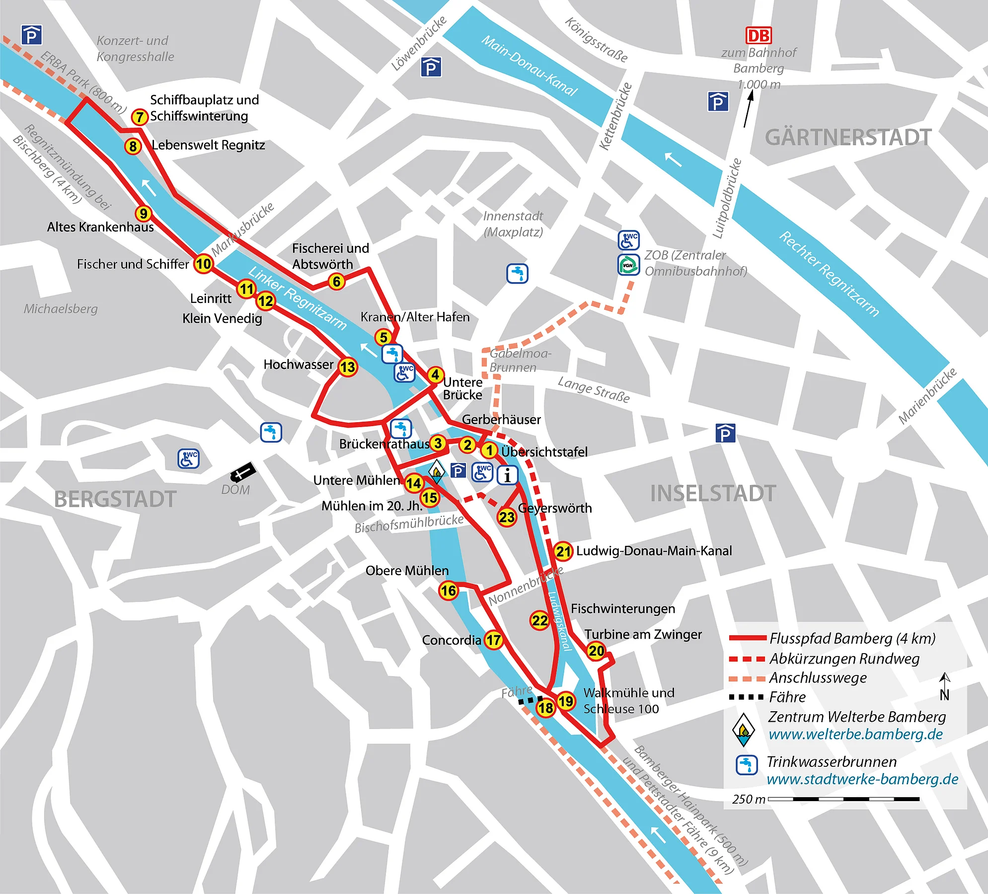 The Regnitz has always borne great meaning for Bamberg. Along the river path, strollers witness the interplay between town and river.