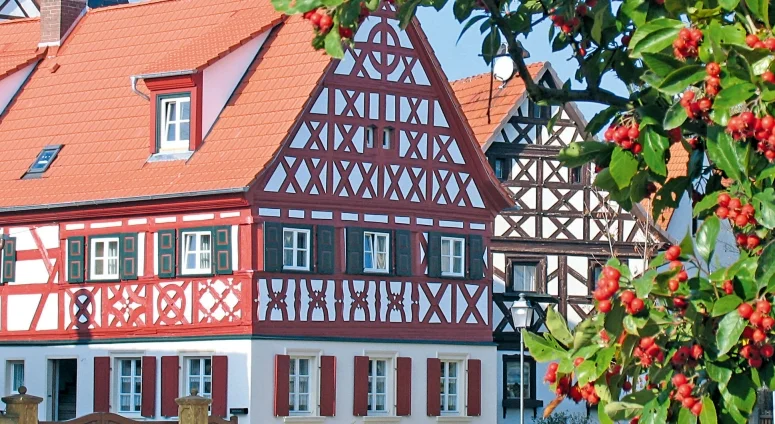 Typical Franconian half-timbered houses with elaborate ornamentation such as St. Andrew’s crosses, additional braces or coloured spaces between the timber frames bestow the picturesque villages of the Itzgrund with their special character.