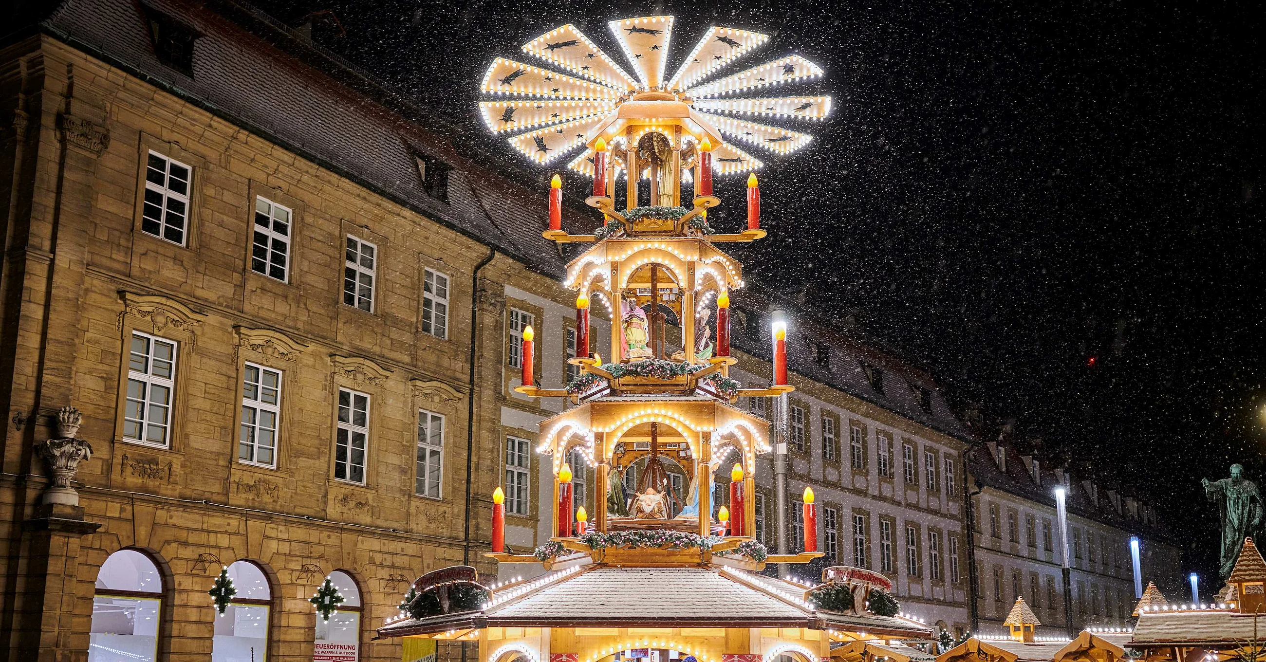 During Advent, Maximiliansplatz square in the pedestrian zone is transformed into a Christmas market, featuring among others, a large Franconian half-timber nativity scene depicting various scenes from the Christmas story. Further markets featuring arts and crafts take place from late November to December in Bamberg and in many of the communities in the vicinity of Bamberg.